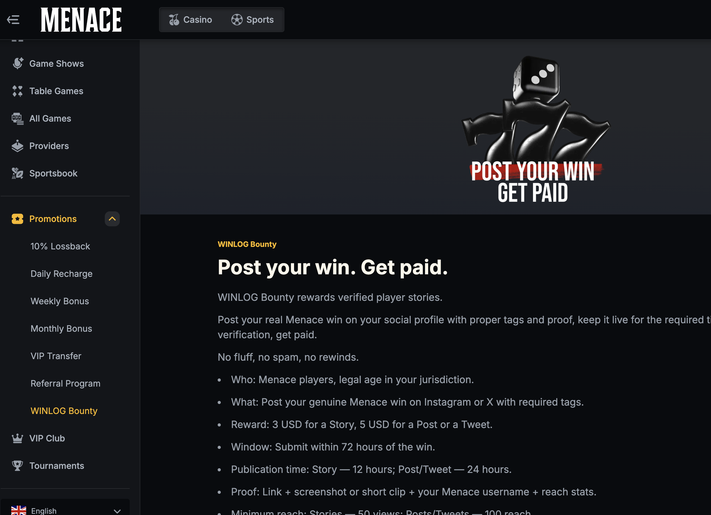 At its core, Menace is a user-centric ecosystem designed to remove friction from the gambling experience. It combines a fast, modern operator with a strong media backbone and exclusive original content, creating a platform built around transparency, speed, and continuity.