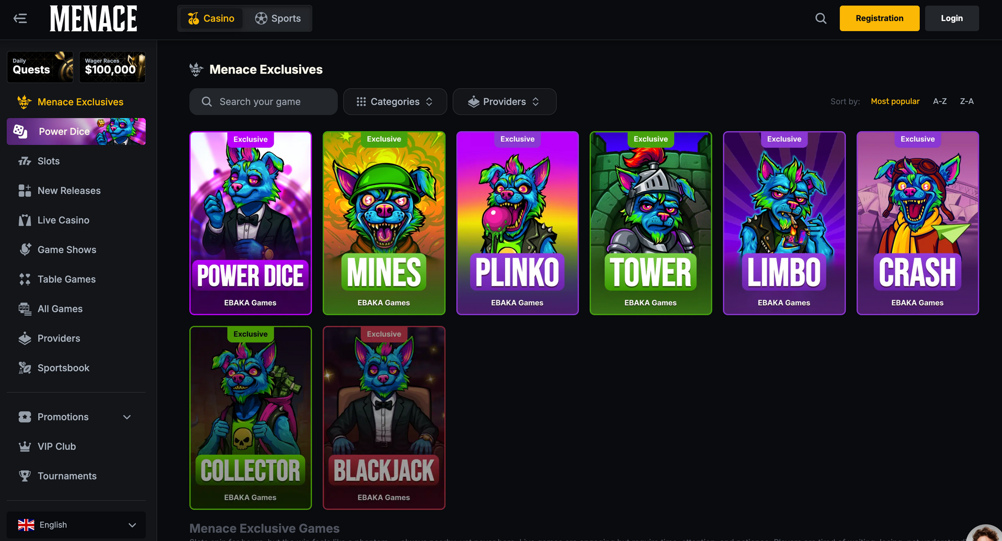 Menace develops its own original games through Ebaka Games, available exclusively on the platform. These titles are built specifically for the ecosystem and expand the platform beyond third-party offerings.