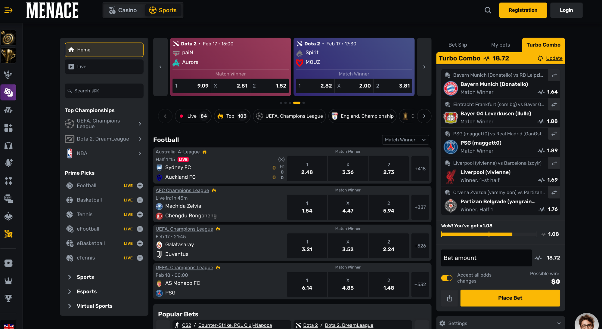 Menace supports betting across 20+ sports, covering both mainstream and niche markets. The sportsbook interface allows players to easily follow live and upcoming events, with competitive odds across categories.